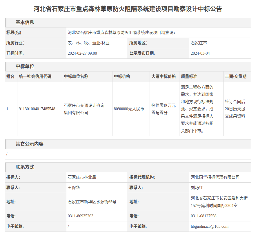 河北省石家庄市重点森林草原防火阻隔系统建设项目勘察设计中标公告